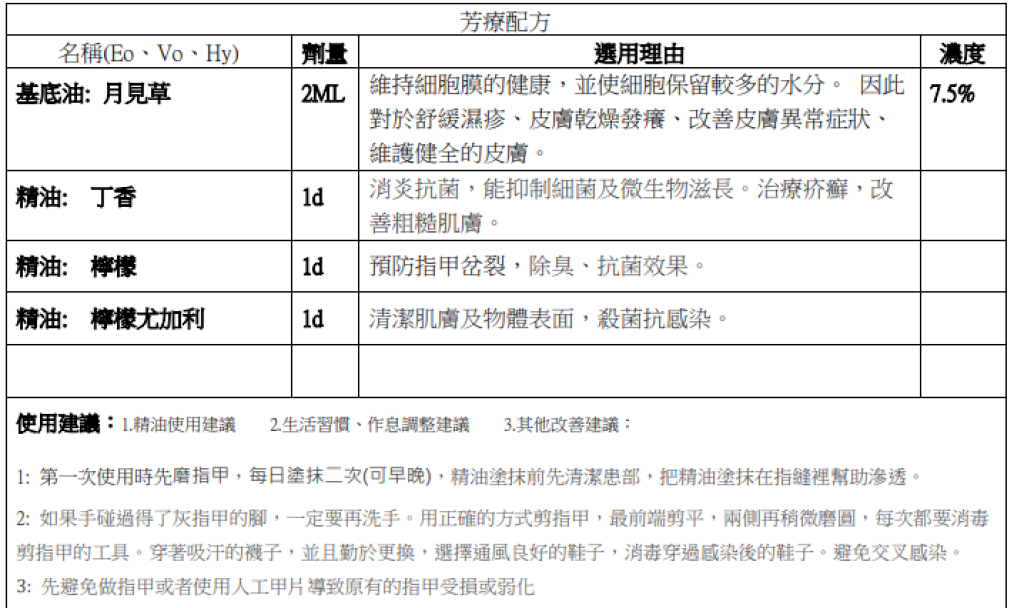 個案從來沒使用過灰指甲的藥,更沒有接觸過精油,在諮詢的過程中,我拿另外一個個案的照片給她看,讓她看到一些變化,並給她信心會有把握改善她的灰指甲。 一開始個案會有點忘記要塗抹,每天我都會打電話提醒她,可能連續幾天下來她也習慣了,現在都會自動在澡後與早上要出門穿襪子前會使用。每次看到個案的進步照片,自己真的都會很開心。