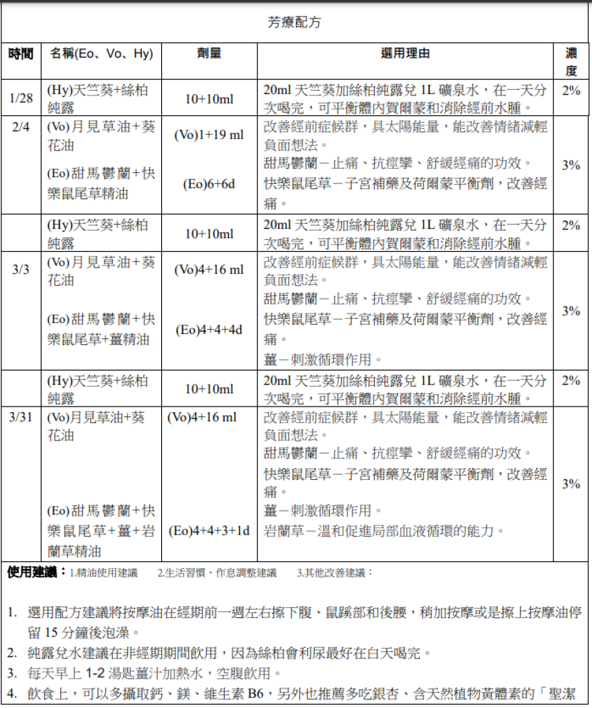 個案對芳療師之建議與感想: 本來擔心拿到很甜或聞起來太花香味道的按摩油,還好芳療師很貼心地先詢問有沒有不能接受的香味或是比較喜歡的香味類型,拿到的按摩油味道很適合我,只是在經前抹點按摩油然後泡澡,就可以有這麼好的效果,覺得芳香療法蠻神奇的。 |