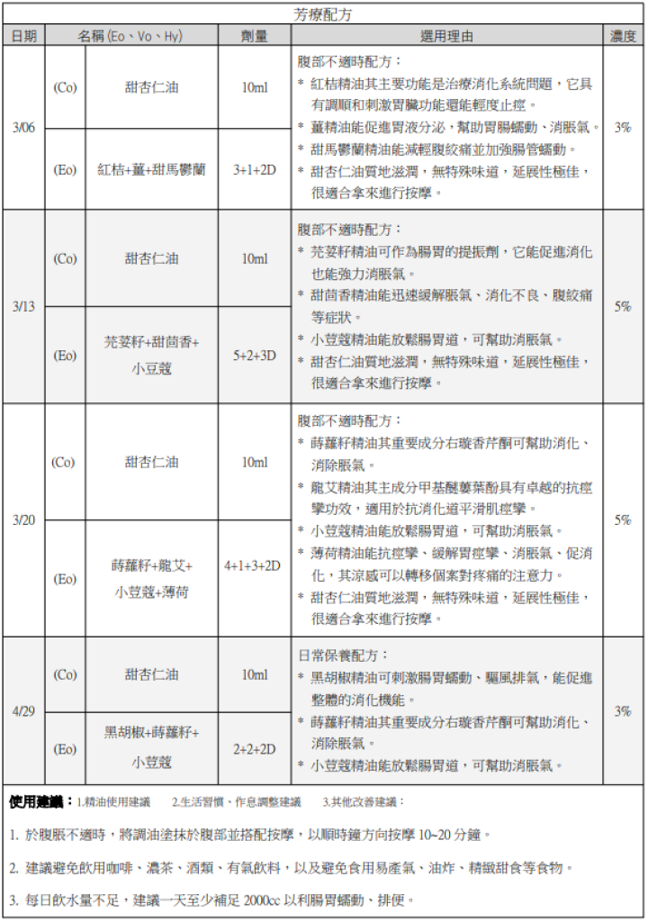 個案對芳療師之建議與感想: “ 這是我第一次體驗芳療,這次體驗讓我見識到精油的威力!它比吃藥有效耶!如果第三瓶有在賣我會願意花錢買!還有!芳療師姊姊人很好,體驗完消脹氣療程後又多送了我 2瓶助眠油,用了後有比較好睡! ” |