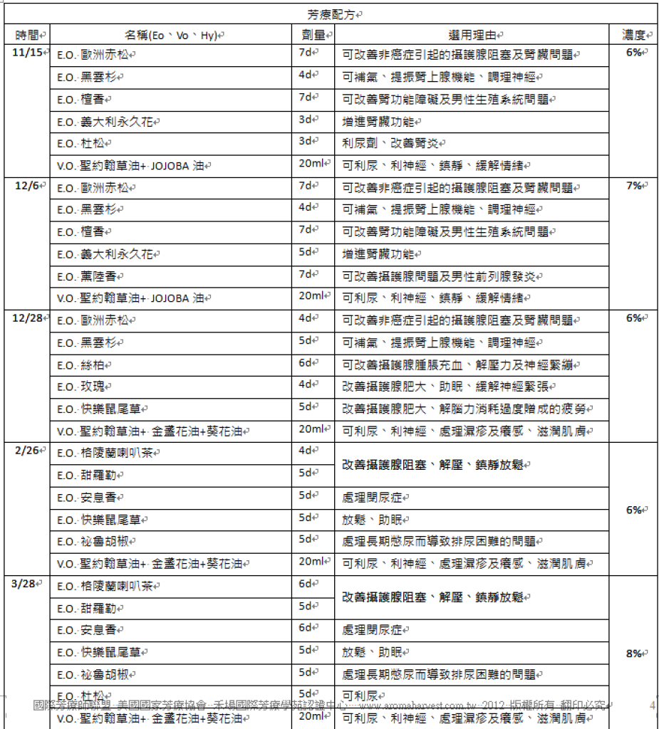 3. 治療方式:建議在醫療院所進行尿流速檢查及聽從醫生建議,並搭配使用按摩油每日調理,細節請參芳療措施(如下)