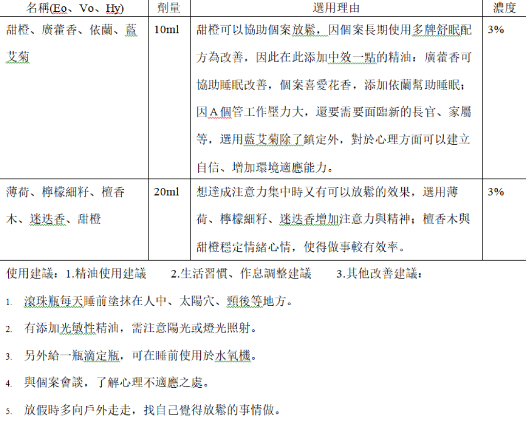 選擇個案喜愛及可以接受的味道,調和完成。在調完油後 2-3 天,到工作場所個案看到我時,直呼驚訝說:瑋葶!你調的油真的很神奇,很厲害,長期使用多牌單方及複方都沒有用,一用你的沒兩天,我多年得睡眠情況居然被你改善了!但幾週後,個案上班時也擦、睡覺時也擦,使得工作狀態變差、嗜睡、注意力無法集中,因此個案再次求助我,挑選個案可以接受的味道,可以醒腦、注意力集中的精油配方,白天時間使用 Attention 配方,晚上使用助眠配方,幾週後情況改善,辦事也更有效率了!