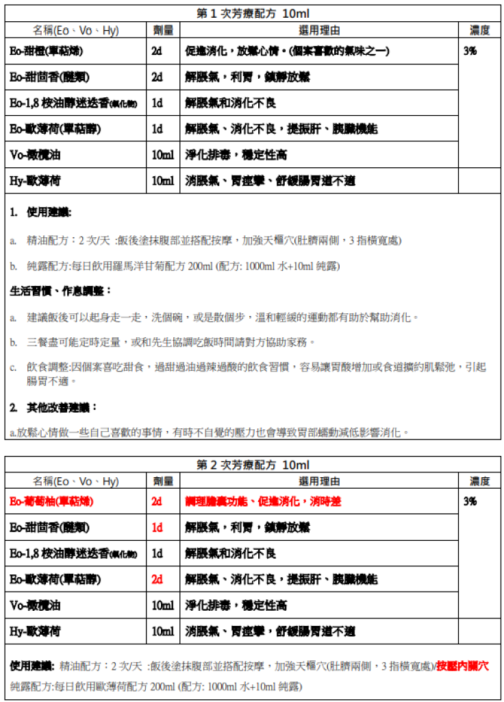 個案是全職家庭主婦,但有一身心障礙的孩子,因此要付出比一般人更多心力在照顧小孩身上。 感謝個案很有耐心的陪著我一次次嘗試,且很有好奇心的詢問。這次的個案讓我發現,當芳療師對 芳療知識和生理基礎越清楚,個案的信任感就會越高,相對配合度也會更高。也因為個案回饋,讓 我從中理解到”量身訂做”的重要性,病症的背後許多都和心理壓力有關,這個是與個案談話中要 從中抽絲剝繭才能建立起來的經驗。 第 1 次配方:以對消化系統有助益的柑橘類作主油,也是因為個案很在意用油之後對身體是否會有其 他的副作用,因而在解說過後挑選了個案日常生活中能接觸到的植物精油內容,主以緩解脹氣為 主。並請個案搭配按摩和飲用稀釋後的純露配方。 第 2 次配方:由於個案使用 5 天後覺得消脹氣的效用不明顯,但打嗝的次數增加了,因此用對消化道 更明顯效力的葡萄柚更換試試看。稀釋的純露配方繼續飲用。 第 3 次配方:個案反映腹脹的消化速度有增快,但卻有點胃食道逆流的情況,因此幫他大幅更換了配 方內容,主力以對胃食道逆流有幫助的”薑”,並請他減低咖啡飲用量和食用甜點的次數。 第 4 次配方:由於個案對薑精油氣味反應較大,因此更換了其他配方,但其實第 3 的配方效果是明顯 的,由於和個案諮詢的過程中發現,個案對於照顧小孩的壓力有些難以負荷但卻不自覺,因此喜嗜 甜食嗜反映壓力的紓解,但甜食又易造成他腸胃的不嗜,生理和心理息息相關,因此調配了對消化 系統有幫助且更能舒壓並長期使用的廣藿香,希望能照顧個案的身心平衡進而改善他的腹脹問題。