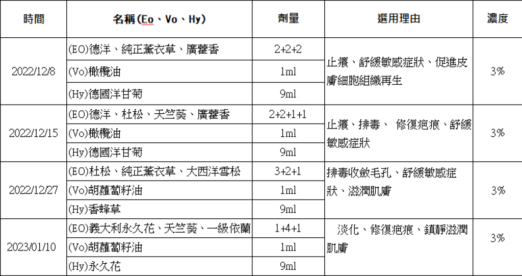 由於是第一個調油個案,而個案也是第一次使用精油,過程中有用油後似乎變得更嚴重的狀況讓人有些不知所措,後來詢問老師調整配方後,個案也能適應,最後能完全康復沒有留疤痕感覺蠻開心的,這次調油經驗讓我學習到應該依個案喜歡的味道去調整,需要多多溝通才能調出適合的油。