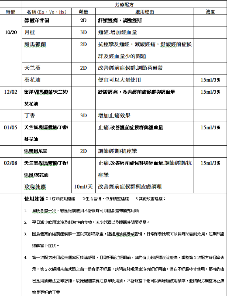 當初在與個案諮詢時,了解到他曾經有因為巧克力囊腫開過刀,所以每個月不管是經期來臨甚至是排卵期期間,他都會有嚴重不舒服反應,所以知道要自己找個案的第一時間,我就想到我這位同事應該就是首選囉~因為很希望可以透過我的幫助,可以幫助他緩解這些症狀,所以直接詢問他,當然還是會擔心他會不會排斥這樣的方法,畢竟他也是從來沒有使用過這樣的方式,甚至平常也沒有在擴香或是購買精油。所以他一口就答應我也是有點意外!! 調油時先避開植物性雌激素的精油,但到後期覺得狀況還ok也算用量不高,於是為了長期的荷爾蒙平衡,後期有幫他加入快樂鼠尾草當保養用油,希望症狀可以持續的調整舒緩,雖然他在第2個月就開始又痛了,於是我直接先用丁香緩解他當下的不適,也有甜馬鬱蘭可以做全面的調整,後續將持續追蹤。 不確定這樣的大膽用油會不會當他是好的,也希望在未來自己可以增加更多專業知識,用油可以更精確。