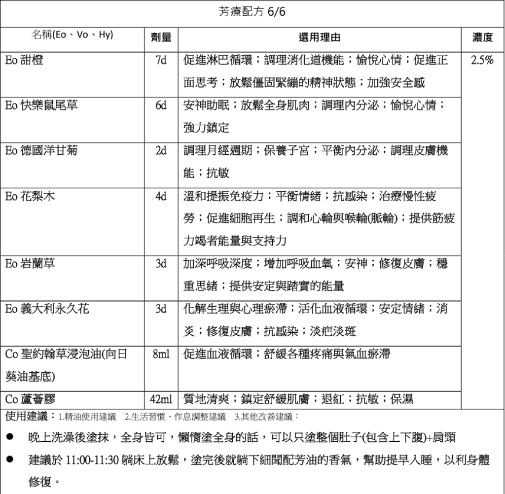 針對這次的個案,覺得比較可惜的是,在首次評估時,因有太多狀況想要改善,難以決定要以哪個症狀為主要改善方向,導致療程目的寫得很凌亂,談了很久才很綜合性的以自律神經失調為主要方向調理。我個人在準備調油的過程中,覺得要考慮到的層面很多。