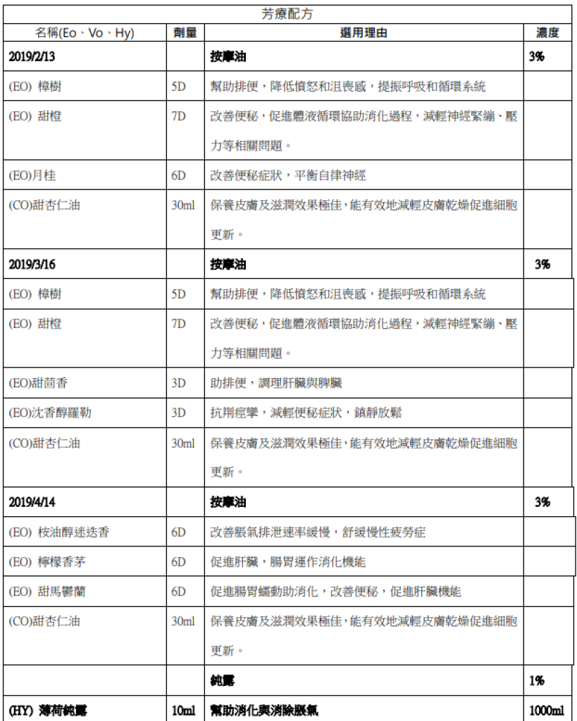 個案對芳療師之建議與感想: 覺得很神奇是這次參加芳療的感想,因為⾝體很快就能感受到改善,尤其⾝體不舒服的燥熱感明顯改善.同時,芳療師提供夏天噴霧精油配⽅,能使在炎熱的⼾外活動時,快速降溫且香氣能快速舒緩煩燥情緒,雙管⿑下有期顯著效果.唯⼀建議是按摩油質地較為油膩,塗抹後⼀定要清洗,否則有些不適. |