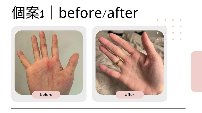 使用【配方二】期間,破皮已癒合但泛紅與乾癢依然存在,用油後的改善變得更明顯。她提到:「以前乾到會裂,現在是乾但不會痛」,手部膚質有感變柔,泛紅區塊也有淡化。情緒層面更是有感進步,入睡變得更快,且清晨醒來的焦慮感減輕。