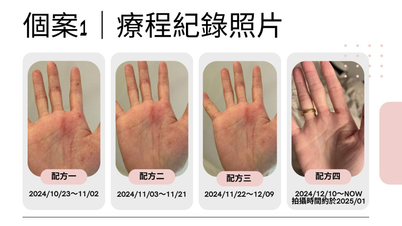 在使用【配方一】的初期,個案正面臨急性破皮與搔癢的困擾。用油後雖無法立即舒緩所有症狀,但她明確感受到皮膚的修復速度有加快,且夜間不再因癢而難以入眠。她表示「雖然還是會癢,但至少可以好好睡一覺」,心理壓力有略為降低。
