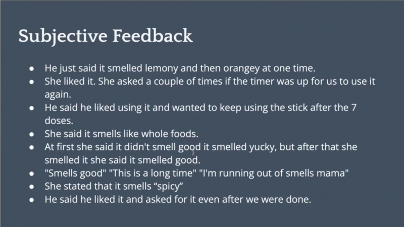 多數孩子一開始對氣味有猶豫,但在後期逐漸喜歡並主動要求使用。有的覺得像 Whole Foods、有人覺得像檸檬或橘子,也有人形容為「辣辣的」。部分孩子會觀察計時器等待下一次使用,甚至在研究後仍想繼續使用氣味棒。整體而言,兒童對香氣接受度高、參與意願強。