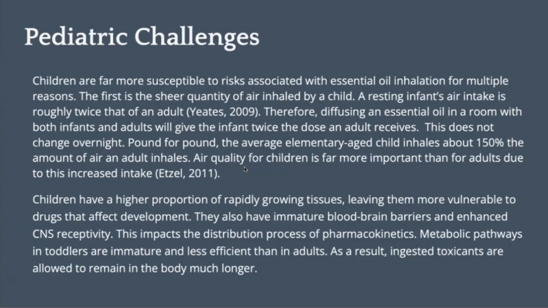 兒童吸入的空氣量遠高於成人,靜息嬰兒的吸氣量約為成人兩倍,因此同樣在房間擴香,嬰兒接觸到的劑量比成人高得多。兒童呼吸速度快、正處於快速生長期,更易受到揮發性物質影響。此外,兒童的血腦屏障較不成熟、代謝途徑較弱,使有害物質在體內停留更久,增加吸入精油時的安全顧慮。