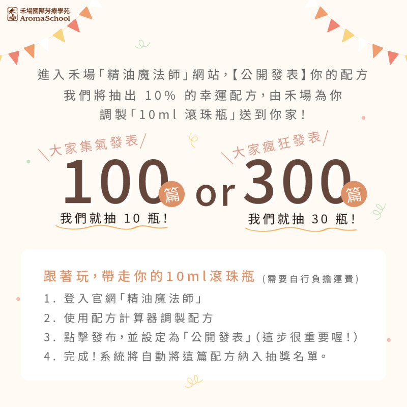 現在,只要把你的配方公開發表在「精油魔法師」 就有 10% 的機會, 由禾場為你調製成專屬的「10ml 滾珠瓶」寄到你手上。