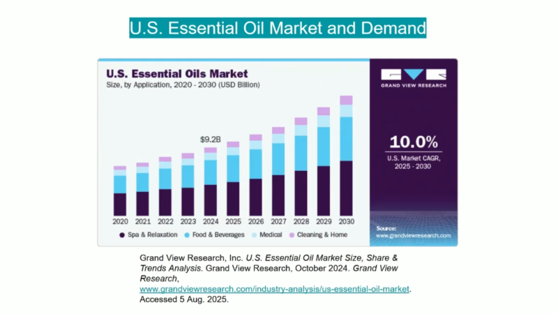 美國精油市場需求持續成長,未來幾年預估每年約10%成長率。需求不只來自消費者,也包含醫療、食品、清潔等大型產業。雖然小型蒸餾廠規模有限,但仍能在地化供應鏈中扮演重要角色,提供可追溯、品質穩定的精油來源。