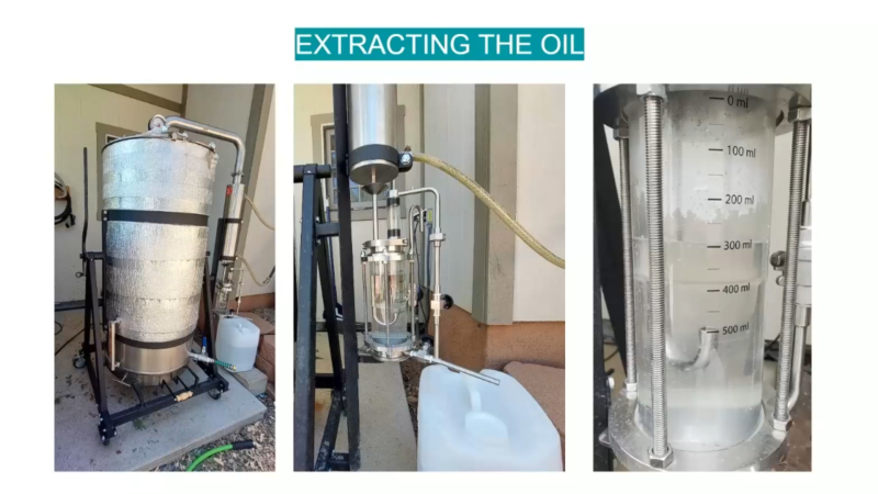 說明蒸餾設備的運作方式,無論處理的是雪還是杜松,蒸餾槽需加入植物與水加熱數小時後才能產生蒸汽。使用的是一套效率較高的小型蒸餾系統,能以精準控溫與較低能耗進行蒸餾。並強調控制蒸餾時間、火力與冷凝效率的重要性,因為這會影響精油與純露的品質與產量。此外,由於美國蒸餾設備供應商不多,他親自比較數家廠商後購買設備,認為對小規模生產者而言,設備選擇與品質極為關鍵。作者也提醒蒸餾後必須妥善保存精油,避免污染或氧化。整體來說,他的經驗強調了蒸餾技術、設備品質與操作細節對精油品質的重大影響。