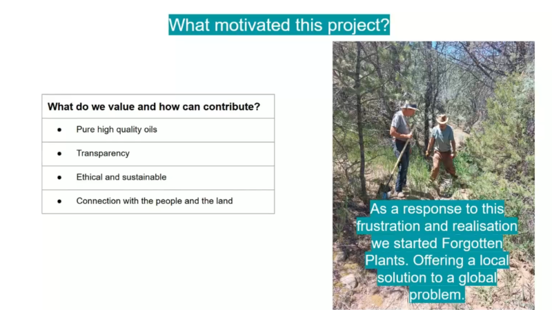 他們發起這個專案的動機源自對精油市場不透明、品質難以掌握,以及缺乏可追溯性的挫折。他們希望提供真正高品質、純粹且透明的精油,並建立更具倫理與永續性的生產方式。同時,他們想重新連結土地、植物與生產者,讓消費者能清楚知道精油從何而來。為此,他們創立 Forgotten Plants,透過在地小規模生產、永續採集與與農民合作,提供一個「全球問題的在地解法」,建立更健康的供應鏈模式。