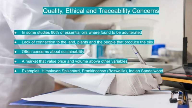 精油市場中充滿品質與道德問題,部分研究指出約八成精油曾被驗出摻假。由於生產端與土地、植物、農民的連結薄弱,使得來源不透明,也引發永續性的疑慮。市場常以價格與產量為優先,忽略植物資源的耗損、生態環境衝擊與採集者的工作條件。部分珍貴植物如喜馬拉雅穗甘松乳香、印度檀香等,更因過度採集或非法交易而面臨壓力。整體而言,精油供應鏈需要更透明、可追溯且負責任的生產方式。