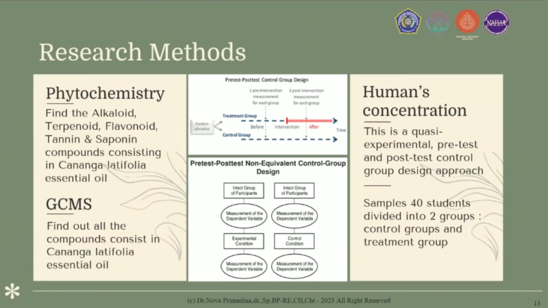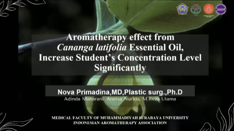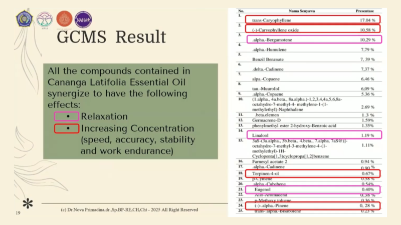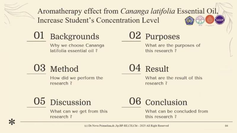 探討 Cananga latifolia(大葉依蘭)精油對學生專注力的影響,並指出研究動機源自印尼依蘭植物的高度普及與經濟價值,但相關科學研究仍十分不足。她說明 Cananga latifolia 與一般依蘭(Cananga odorata)在分類與化學成分上有所不同,因此有必要進一步分析其芳香療效。作者透過文獻搜尋與 GCMS 化學分析蒐集植物成分資料,建立研究基礎。此研究旨在以科學方式確認大葉依蘭精油是否能有效提升學生的專注力,並為印尼本土植物的芳療應用提供更多數據支持。