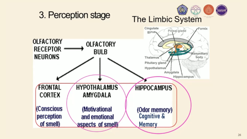 解釋嗅覺訊息如何透過嗅球傳入大腦邊緣系統,影響情緒、動機與記憶。精油分子的氣味會快速觸發下丘腦、杏仁核與海馬迴,這些區域掌管情緒反應、激勵行為以及氣味記憶,因此香氣能立即改變人的情緒與專注狀態。她強調不同依蘭種類的化學成分不同,氣味調節效果也不同,而大葉依蘭(Cananga latifolia)的草本木質調與含氧單萜特性,更容易提升清醒度與穩定注意力。研究結果顯示,聞到大葉依蘭後,學生的專注力明顯提升,表現分數從平均 2.4 提升到 4,證實其對認知功能具有促進作用。