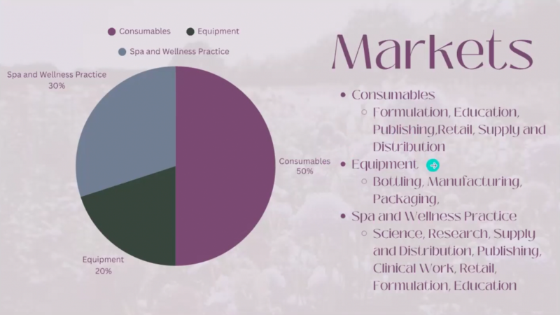 芳療產業最大市場領域是「消耗品」,占整體的 50% 。 第二大是療癒服務(NAHA 芳療師主要位置),占 30%。 芳療師若想擴展收入,不能只做服務,應布局消耗品與教育。