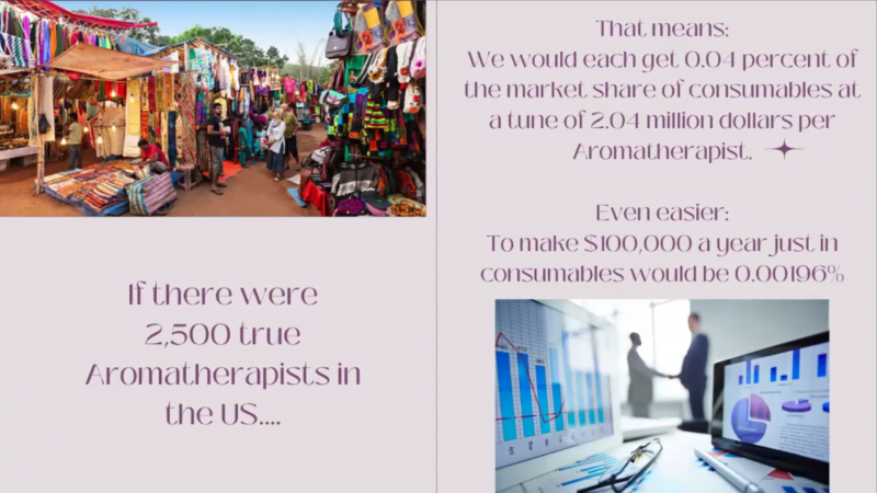 若美國只有 2,500 位專職芳療師,每位芳療師的市場占比是 0.04% 在消耗品市場,平均每位芳療師對應 204 萬美元的市場量,如果只要一年收入 10 萬美元,只需要 0.00196% 的市場份額。