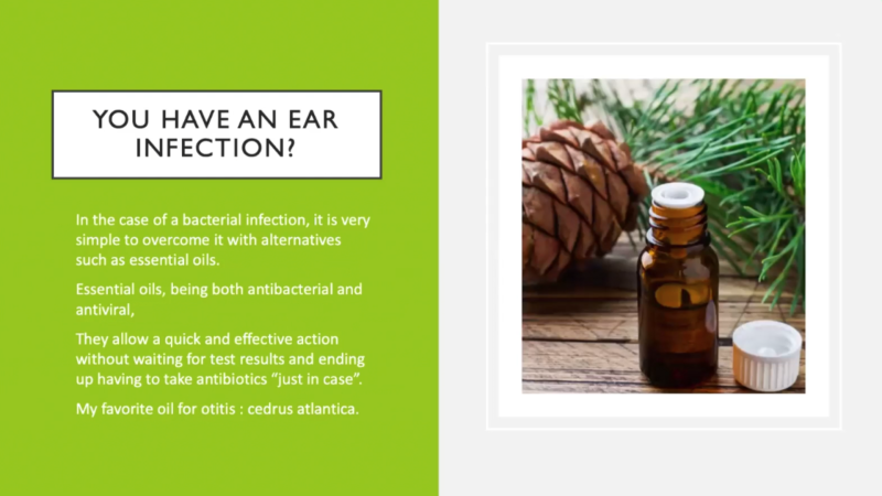 大多數耳部感染其實不需要立刻依賴抗生素,在沒有做細菌培養檢測之前,往往無法確認是否為細菌感染,因此使用具抗菌與抗病毒性的精油能提供快速而有效的替代方式,例如雪松(Cedrus atlantica)等樹木類精油具有良好成效。她解釋,精油能在症狀初期介入,減少不必要的抗生素使用,同時也能舒緩疼痛並促進局部循環。她提醒,若確定感染嚴重或症狀未改善,仍需就醫,但在多數一般情況下,像 Cedrus atlantica 這類樹木精油已能成為安全而有效的家庭照護選項。