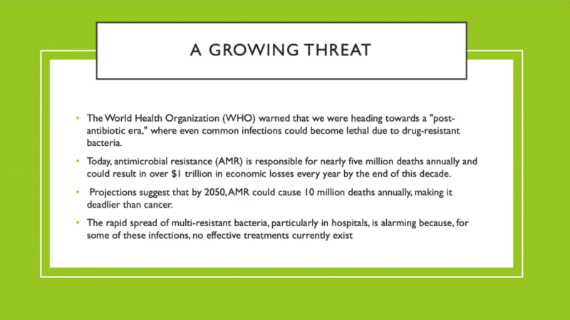 引用世界衛生組織(WHO)的警告,指出人類正逐漸進入「後抗生素時代」,一旦常見感染變得無藥可醫,人類健康將面臨前所未有的危機。抗微生物抗藥性(AMR)每年奪走近 500 萬條生命,並造成逾 1 兆美元的經濟損失,若沒有改善,到 2050 年全球死亡數恐達到 1000 萬。她解釋,許多醫院正在面臨多重抗藥性細菌蔓延,而某些感染甚至完全沒有有效療法。她認為精油所提供的天然抗菌多樣性,是未來不可忽視的重要資源,使人們能透過自然方式重新取得對抗感染的能力。