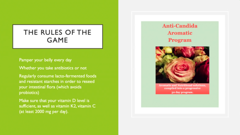 不論是否使用抗生素,維持腸道健康都是預防感染與增強免疫力的核心。她建議每天都要好好「照顧你的肚子」,透過發酵食物、抗性澱粉來滋養腸道菌相,同時注重維生素 D、K2 與高劑量維生素 C,以支持免疫系統運作。若腸道菌相健全,身體能更快恢復,也更能抵抗念珠菌等問題。她也分享一個 30 天的精油與營養整合方案,讓身體能在日常中逐步重建健康。核心概念是:把腸道放在優先位置,免疫力自然變強,而不必等到生病才開始補救。