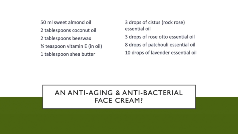她分享自己愛用的抗老抗菌面霜配方,並說明這款面霜能同時做到皮膚滋養、肌膚修復與抑菌保護。像岩玫瑰(Cistus)、玫瑰奧圖、保加利亞玫瑰、廣藿香與薰衣草等精油皆具有抗菌、抗氧化與增強肌膚彈性的作用,能提升皮膚屏障並改善細紋。她指出,許多研究已證實部分芳香分子能抑制 90% 以上的細菌生長,因此這樣的配方能讓皮膚維持更乾淨穩定的狀態,同時自然散發健康光澤。她也強調,配方簡單就能做到高效護膚,是她多年臨床經驗中最常被客戶詢問的實用產品之一。