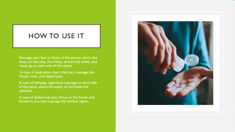 這套按摩方法主要針對感冒、發炎、疲倦與腹部不適等症狀,透過刺激足部、脊椎兩側與腎上腺位置,可迅速提升循環與免疫反應。例如呼吸道感染時,可按摩喉部、頸部與上背;若疲倦無力,則強力按摩腰上脊椎兩側,以喚醒腎上腺;腹痛時可按摩手臂、手背與腰部。她提醒,精油按摩的目的不只在於紓緩症狀,更是協助身體恢復自身的修復能力,並讓免疫系統能在更短時間內恢復平衡。她認為,這比單純等待康復來得更積極有效。