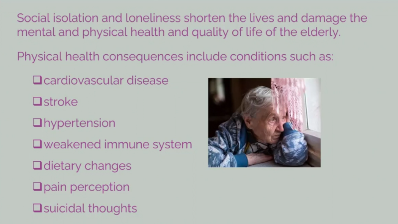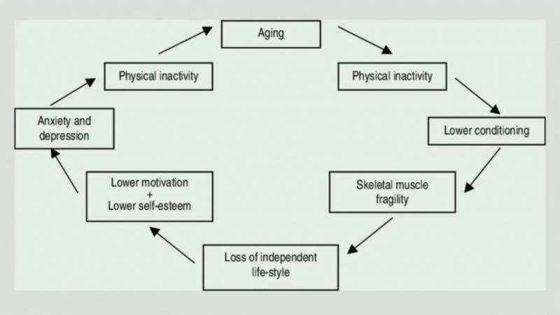講者描述老化引發的惡性循環:健康下降導致活動力減少,肌肉與平衡能力變差,使長者更不願意移動,進一步弱化身體機能,也失去獨立性。這帶來自尊下降、焦慮與憂鬱,使身體活動更少,反覆循環。加拿大估計每四位長者就有一位面臨社會孤立,而孤獨帶來的影響包括心理健康惡化、壽命縮短及生活品質下降。孤立甚至可能造成極端的想法。研究證明孤獨會加速認知退化,甚至讓失智症惡化速度提高 40%。社會孤立也增加醫療支出與社會負擔,形成多層次的惡性循環。
