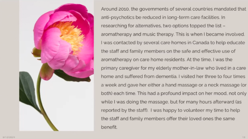 Colleen分享多年在安養院中推動芳療的經驗,以及一些關於失智症與照護環境的統計資料。她提到自己從事這項工作已超過十三至十四年,雖然現在主要以學校事務為主,但過去的實務經驗仍讓她能提供有價值的洞見。接著她說這場分享會聚焦於失智症患者的照護、芳療在照護環境的應用,以及對長者生活品質的改善效果。