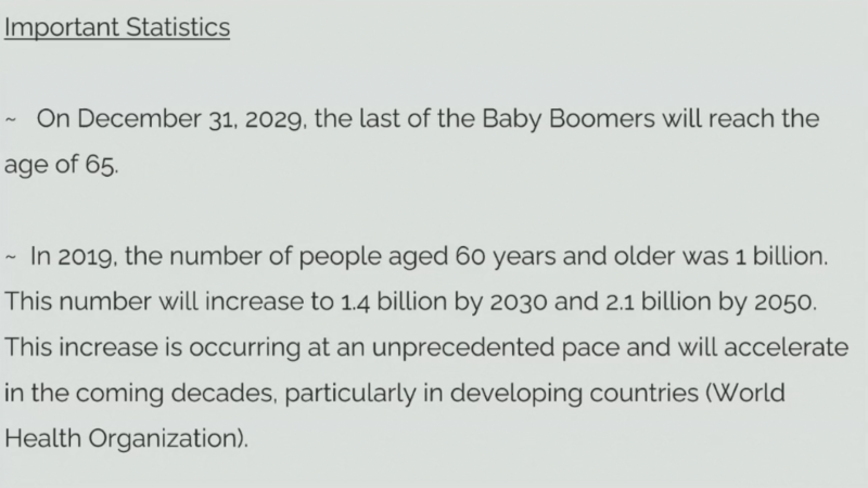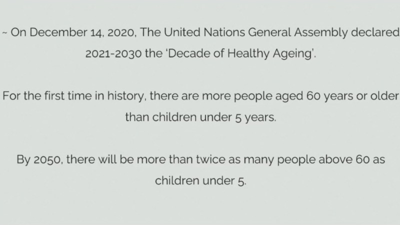 全球超過 60 歲的人數已比 5 歲以下兒童更多,且到 2050 年將倍增。她指出人口老化速度快,加上長者死亡率增加,使得人口結構面臨下降趨勢。她身在加拿大,也觀察到國家的醫療系統進入危機,醫護人力嚴重不足、財務有限,醫療人員承受極大壓力。