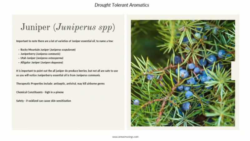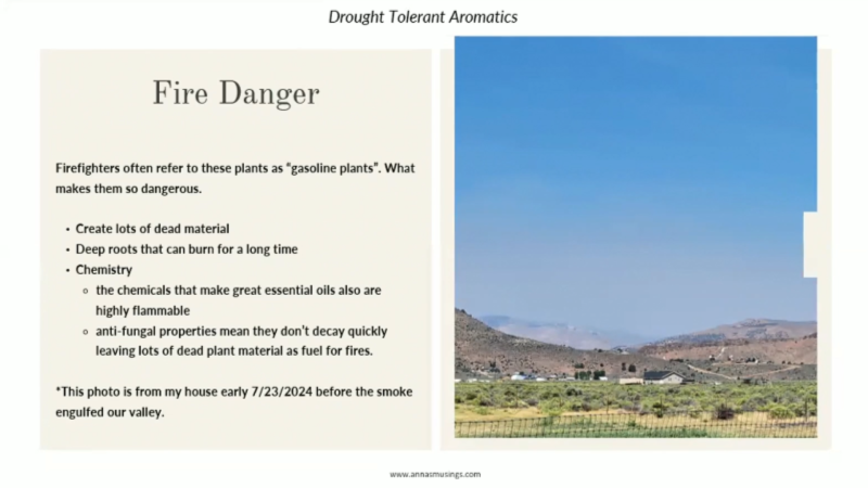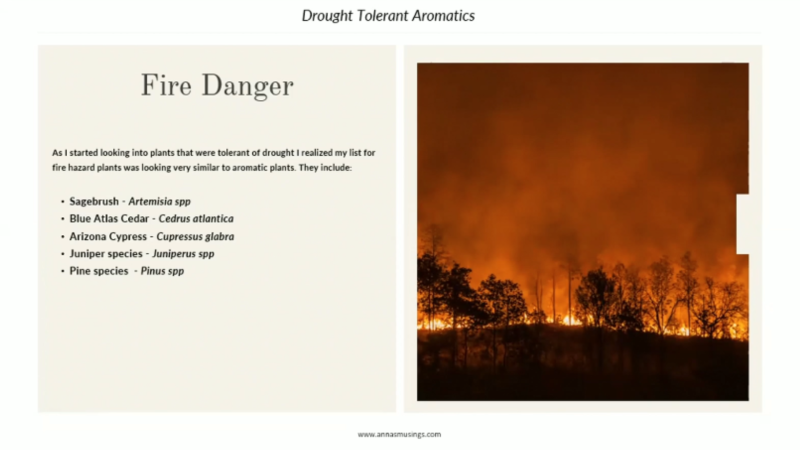 在整理耐旱芳香植物清單時,發現其中多數植物其實都在火災風險清單上,因為它們的高精油成分讓植物非常容易燃燒。她雖然驚訝,但也理解這些植物仍能繼續保留在生態中,只要學會如何讓它們安全共存。她列出一些具高油含量的植物,如松樹、杜松、鼠尾草等,並指出消防員甚至稱它們為「汽油植物」,因為一旦燃燒,會像爆炸一樣快速蔓延。因此,在高火災風險地區工作或生活的人,必須學習如何管理、修剪與配置這些植物,以減少火災危險。