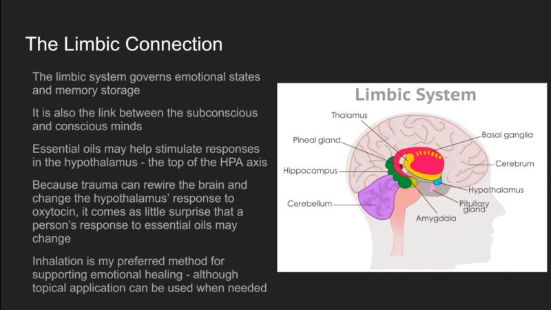 講者分享自己在經歷創傷之後,對植物療法與精油反應明顯改變,因此開始深入研究。她說明邊緣系統主管情緒與記憶儲存,是較原始的大腦區域,連結潛意識與意識。氣味記憶正是透過這個系統運作,精油的香氣能刺激杏仁核、啟動戰或逃反應,也會影響下丘腦與 HPA 軸(下丘腦-腦下垂體-腎上腺系統)。腎上腺像戴在腎臟上的小帽子,參與壓力荷爾蒙的調節,這些都解釋了為什麼氣味與情緒、創傷反應有這麼密切的關聯。