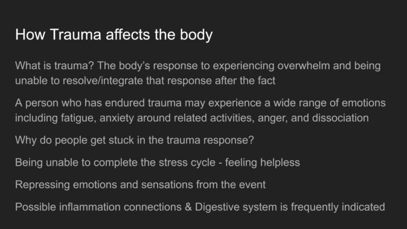 這張談的是創傷症狀的多樣性。常見的包括疲憊、在某些活動前感到焦慮、容易生氣等,也可能出現解離感,不一定是劇烈的解離發作,而是覺得與身體分離、下班後癱在電視前,沒有力氣整理家務等。許多人一開始並不會把這些困難與創傷連結起來,以為只是自己懶散或意志力不足。講者說明,創傷其實常是背後的關鍵因素,並引入 Peter Levine 與「身體經驗療法」,提到《喚醒老虎》一書中描述動物如何自然釋放壓力,不會像人類一樣卡在同一種創傷反應裡,為之後討論身體如何完成壓力循環做鋪陳。