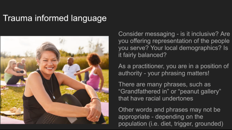 「代表性與包容性」在服務中的重要性,如果經常來訪的個案樣貌,和社區實際人口結構差很多,可能代表有一大群人覺得自己不被這個空間接納,需要重新思考訊息與宣傳。她舉例一間瑜伽教室,負責人特別在牆上張貼大尺碼女性做瑜伽的照片,因為她專門幫助胖女孩找到適合自己的練習方式,即便無法做傳統高難度體位法,也能安全練習。這樣的視覺呈現與文字訊息,向社群傳達「你也被看見、被歡迎」,若是出自真心,人們會感受到,也更願意踏進這個空間。