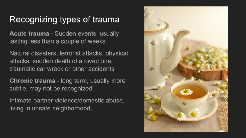 這張聚焦在慢性創傷。她舉例家庭暴力、親密關係暴力、長期處在不安全社區或遭遇系統性歧視等,雖然不一定像單一重大事件那樣明顯,卻會長期侵蝕安全感。身為芳療師,我們不需要知道來訪者的全部故事或每一個細節,也能提供支持。她強調自己不是晤談或心理治療師,不負責處理事件經過,而是陪伴個案面對「現在的感受」,幫助他們在當下建立安全與復原力。即使外表看起來沒有明顯的急性創傷,長期、細微的壓力一樣可能留下創傷痕跡。