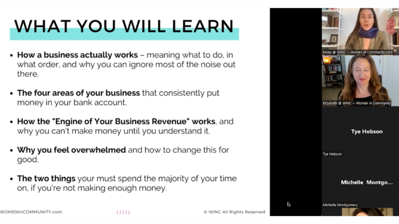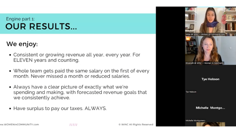 在女性創業運動尚未被廣泛討論之前,Myka 就已經為其命名。她將一流的商業培訓與神聖文化(sacred culture)相結合,而當時「商業與靈性」的結合充其量還是一個禁忌話題。在我們女性商業和領導力運動中,她作為一位富有遠見的革命者已經活躍了十一年。WINC 提供了一流的商業培訓課程,女性們經常形容它是「突破性的」、「我做過最好的投資」,以及「結合了男性和女性最佳商業運營方式」的課程。