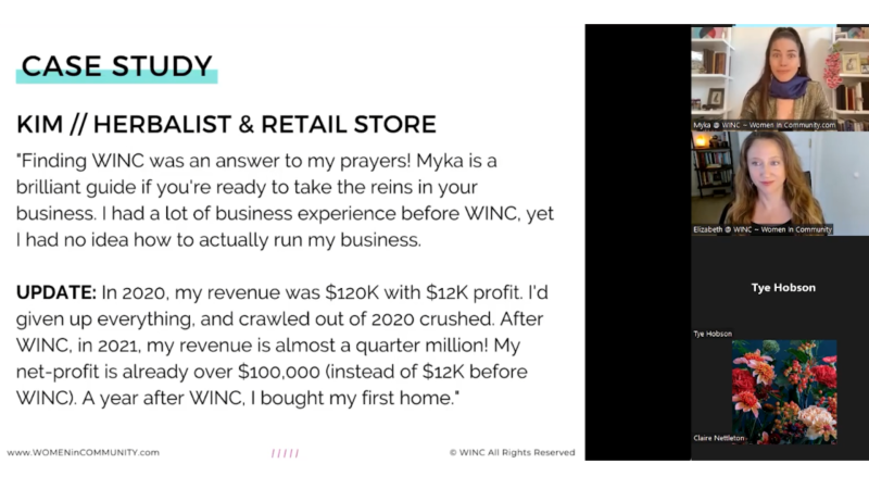 Kim,一位草藥與零售店老闆,也做芳療與植物相關產品。她說找到 WINC 就像得到禱告的應驗,以前雖然有豐富的商務經驗,卻完全不懂如何真正經營自己的店。2020 年時,她名義上有六位數營收,但一年淨利只有一萬二美元,人也在疫情後幾乎被壓垮。加入系統後,2021 年營收接近二十五萬美元,淨利超過十萬美元,從一萬二跳到十萬,甚至買下家族中第一棟自己的房子。