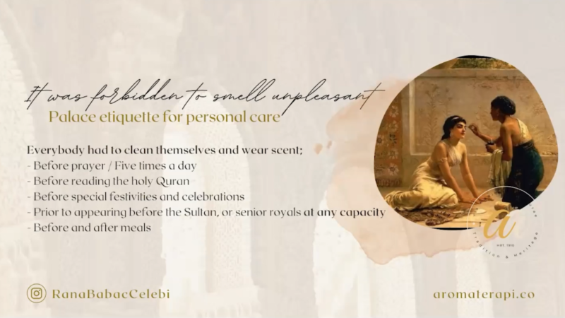 裡談的是後宮女性在皇宮中的生活與規範。她們不只是為蘇丹生育後代,也是宮廷娛樂與社交的一部分。對所有住在宮裡的人來說,「不允許身上有臭味」是基本禮儀,因此必須經常清潔身體並使用香氣。她們的日常生活包含閱讀、飲食、跳舞、聊天與彼此作伴,同時要維持外貌美麗與氣味宜人。乾淨與芬芳成為宮廷生活中不可或缺的一環。
