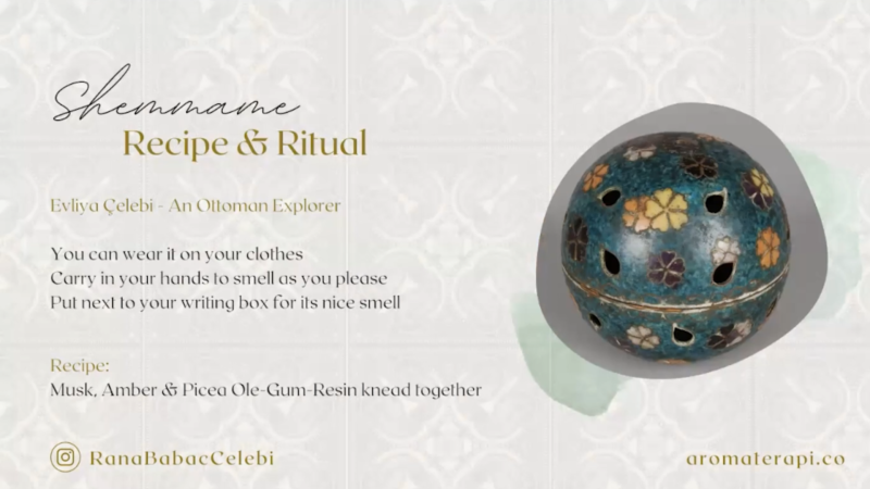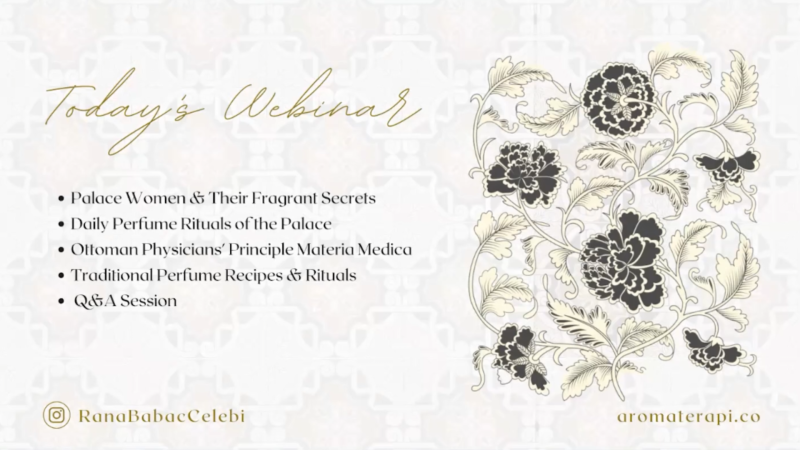 她會先談奧圖曼宮廷與後宮文化,特別是宮廷女性與香氣儀式的關係,接著介紹皇宮裡每日的用香習慣,包含居室、飲食與廚房如何被香氣包圍。之後會簡介奧圖曼御醫的醫藥觀點與重要原料,但本場只聚焦於其中一種原料作深入說明。最後,她將分享三個奧圖曼帝國時期的香水或香方配方,說明實際使用方式,並搭配圖片與實作示範。