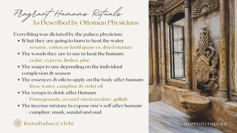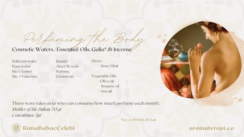 回到「香化身體」的主題,提到蘇丹給後宮每月固定的香料配額。若蘇丹想召見某位嬪妃,她會用這些珍貴的香料與鹽來準備自己。所謂「化妝水」多半是以玫瑰水為基礎,再加入琥珀等珍稀原料融解或稀釋於其中。她們也會使用橄欖油、芝麻油或堅果油,並浸泡檀香木等香木製作芳香身體油。此外還有特別的「靈藥」型香氛,只供王太后等高位女性使用,是極為奢華且具醫療意味的香配方。
