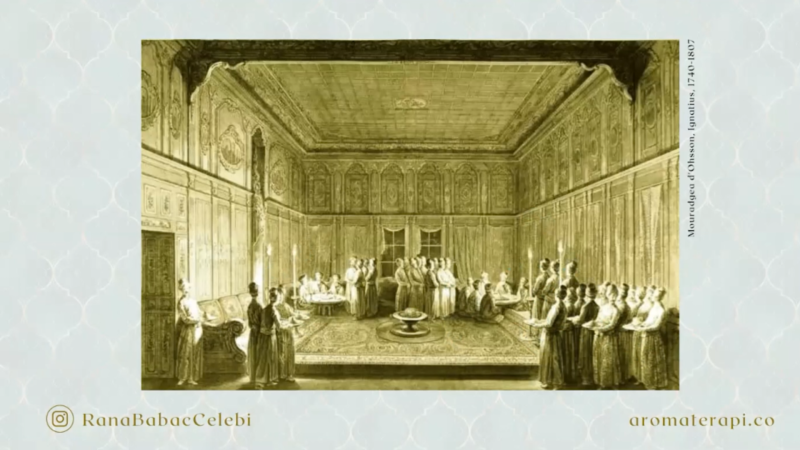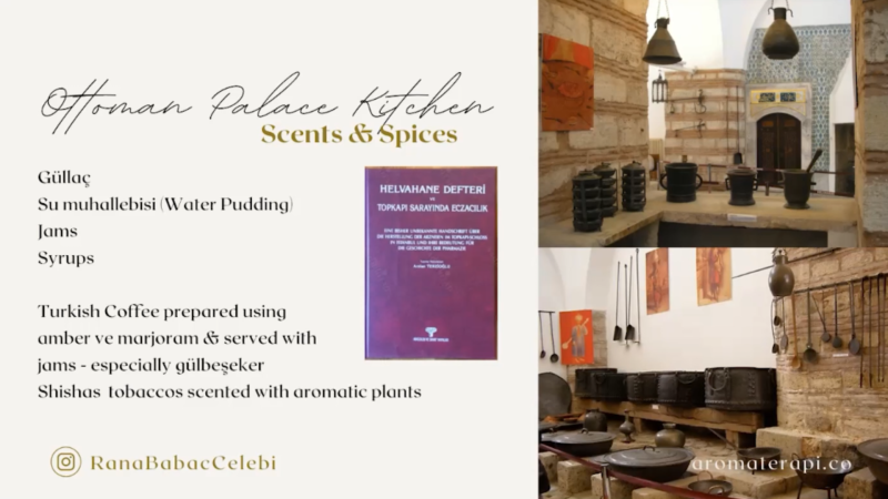 宮廷中常用芝麻油,將粉紅玫瑰花瓣在油中浸煮數週,使油脂充分吸收花香,再供後宮與心臟強化相關的調理使用。最後會再介紹一種在土耳其語中稱為「膏狀香」的製品,它像香膏或香膏糊,可塗抹於身體。宮廷也在日間頻繁焚香,臥房、走廊與餐桌旁都充滿煙霧與香氣,無論是早午晚餐都會點香,使空間與人體同時被薰香。