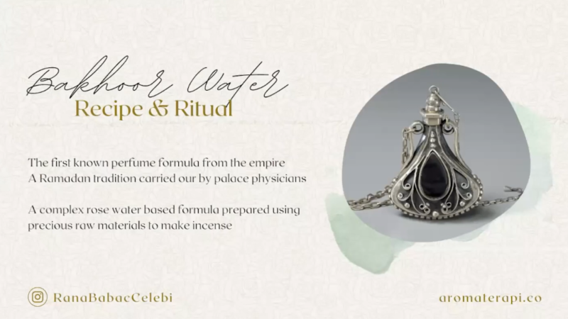 接著她介紹「Bakhoor Water」香水配方。這是目前所知帝國最早的香水配方之一,記載於前面提到的手稿中,相傳由征服伊斯坦堡後的蘇丹下令調製,後來成為齋月期間的固定儀式。每到齋月第十五天,當人們因長時間禁食而身體變得輕盈,被視為靈魂更接近表面的時刻,宮廷御醫會在眾人面前親自調製此款以玫瑰水為基底、加入多種香料與樹脂熬煮而成的「薰香之水」,象徵以美好香氣滋養靈魂,是結合宗教、醫療與香藝的儀式。