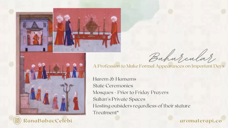 接著她談到這些薰香專業人員在重要日子中的角色,例如畫面中展示的是蘇丹兒子行割禮儀式時的場景,負責焚香的人會在蘇丹面前展現他們的技藝。這些調香與焚香配方不只在後宮與浴室中使用,也被帶入清真寺,特別是在星期五聚禮前,會先以薰香淨化空間。從十五到十九、二十世紀,因為各種瘟疫與傳染病頻繁,這樣的薰香同時被視為一種防護與淨化措施。