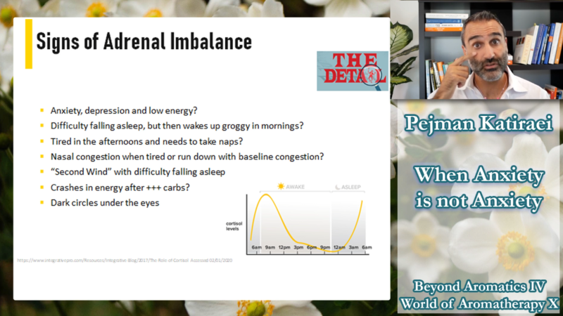 腎上腺失衡在臨床上的典型表現:焦慮、憂鬱、沒精神,晚上難入睡、早上卻很難清醒,下午疲倦想打盹,容易鼻塞或感冒拖很久,晚上又出現「第二波精神」睡不著,吃大量碳水後精力崩盤、眼下有黑眼圈。許多醫師只看見情緒與行為,就急著用洋甘菊或香蜂草等來「安神」,卻忽略背後真正的腎上腺功能問題,因此效果常常有限。