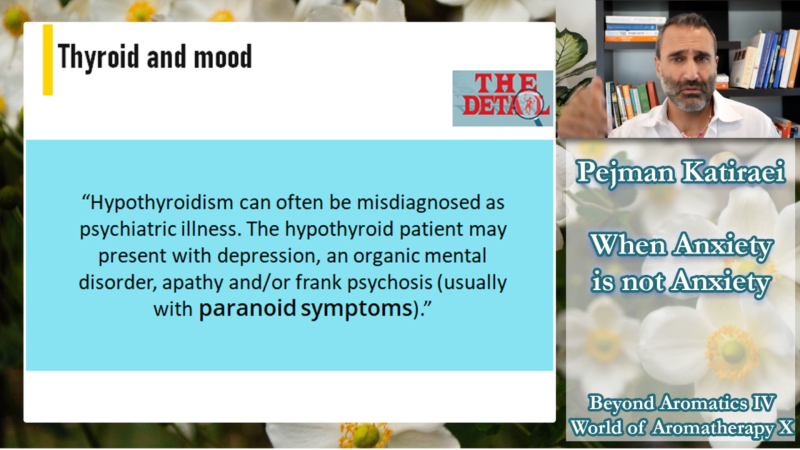 這裡談到甲狀腺與情緒的關係:甲狀腺機能低下經常被誤診為精神疾病,病人可能被貼上憂鬱、冷漠、甚至有妄想或精神病症狀的標籤。講者提醒,我們常把「人人都這樣」當成正常,但對個別病人其實並不正常。檢驗結果看起來在參考值內,不代表生理真正處在最佳狀態;若能敏銳覺察甲狀腺不平衡造成的情緒波動,就有機會在焦慮、ADHD、OCD 等問題上帶來根本性的改善。