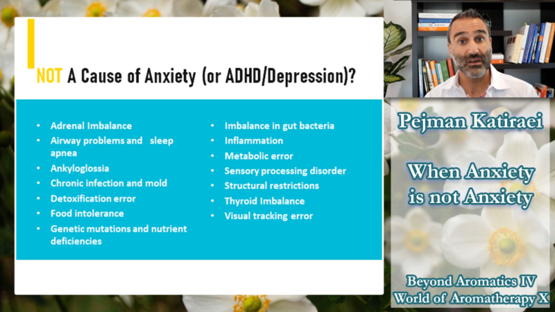 「NOT A Cause of Anxiety?」這張投影片列出一長串看似與焦慮不直接相關,卻可能是關鍵的身體問題,例如腎上腺失衡、呼吸道問題與睡眠呼吸中止、舌繫帶過短、慢性感染與黴菌、解毒功能失誤、食物不耐、基因變異與營養缺乏、腸道菌失衡、發炎、代謝錯誤、感覺處理障礙、結構限制、甲狀腺失衡與視覺追蹤問題等。